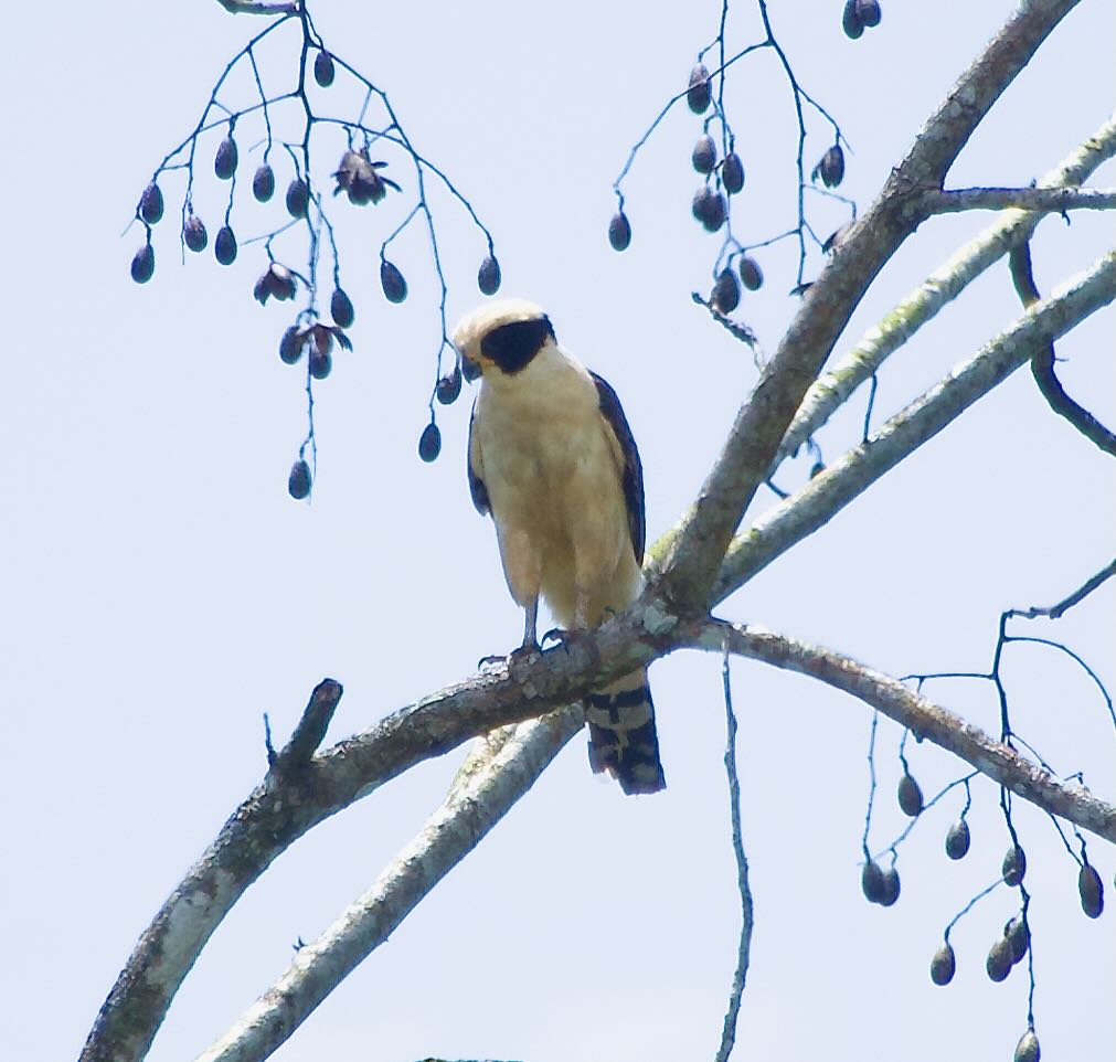 We walked the road for a bit but didn’t see or hear any Purple Fruitcrows and we just did not have the time to continue through the property. Even with three weeks it seemed like we did not have enough time to explore all the places we wanted to. We continued back on the highway and as we were driving I sighted a white and black raptor in a tree beside the road. I knew this was likely our Laughing Falcon lifer and Jerry pulled over quickly, got out and took some photos from a bit of a distance. Always nice when the lifers position themselves along the roadway LOL!