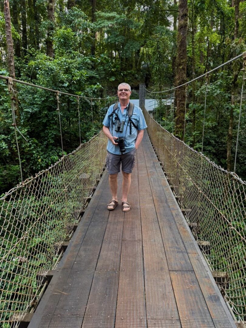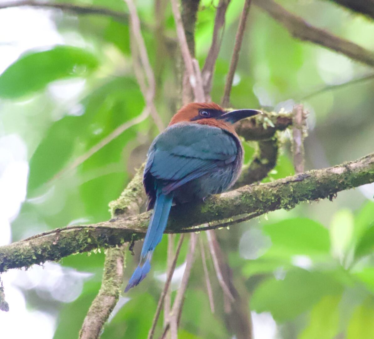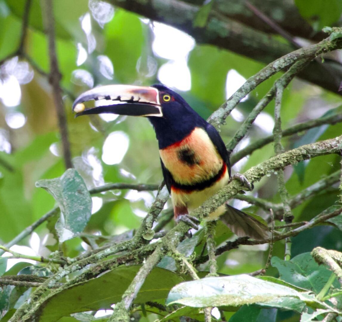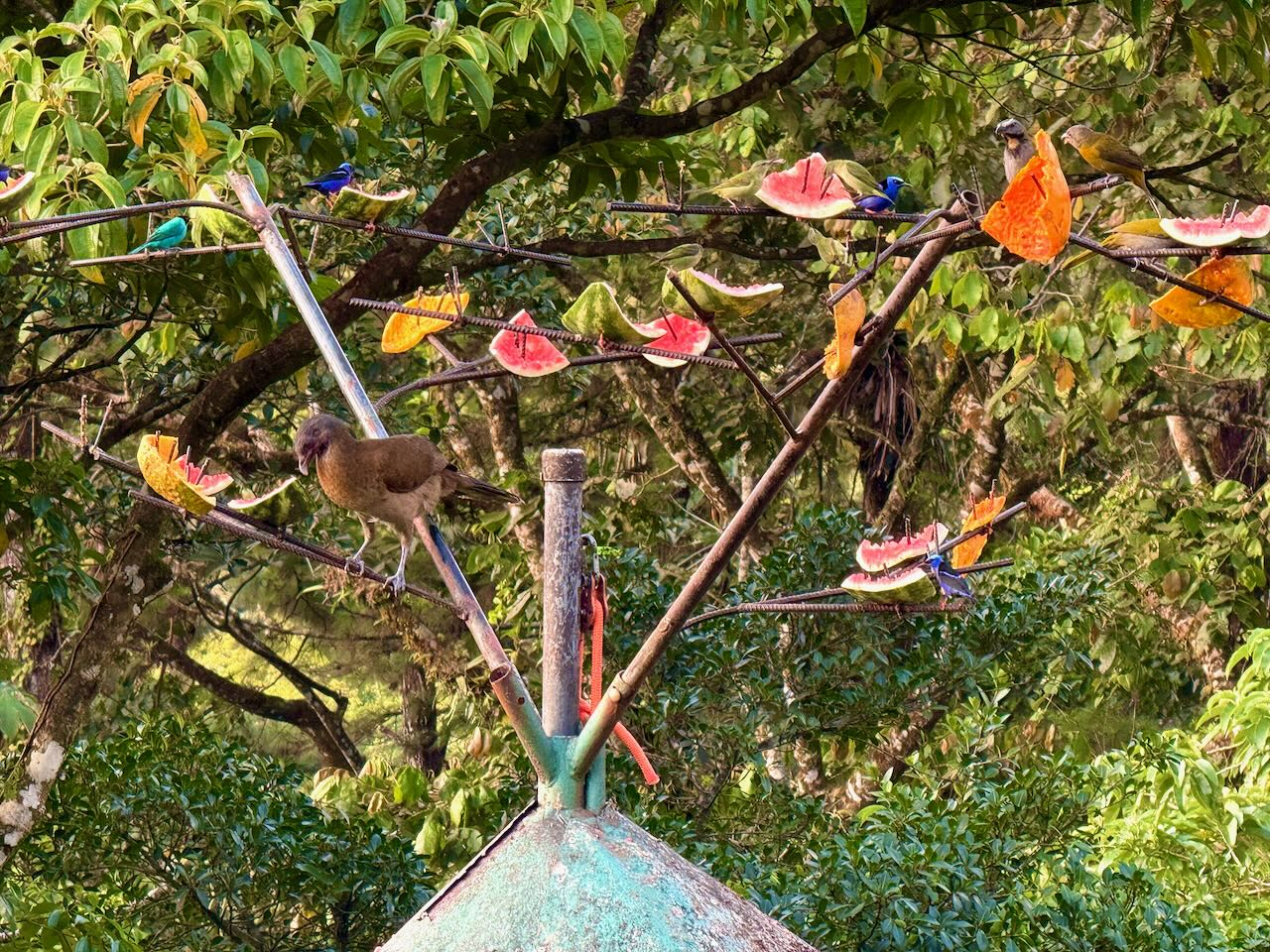 Jaime let us know that another bird was singing very close – A Western Woodhaunter – what a name! It ended up basically right in front of us in a thick tangle allowing us glimpses of it before it flew off so sadly no pictures. We also finally added a Bright-rumped Atilla that was singing and singing near us but not showing itself. We have had this bird come up on Merlin numerous times but we have not figured out which song matches it so this time Jaime helped and we isolate the song so we can add it to our list. On the way back UP the road we stopped often to try for other species of Trogons we have not seen and we ended up adding a Double-toothed Kite that flew into a tree across the road from us. Back at the lodge we took a walk along the paths near the Hummingbird gardens and a Gartered Violaceous Trogon perchs right beside us. It is so close that Jerry cannot get the whole bird in the shot. It appears to be nesting in the area and seemed fine to stay where it was despite the people coming past along the path. All in all is was another great experience with a guide.