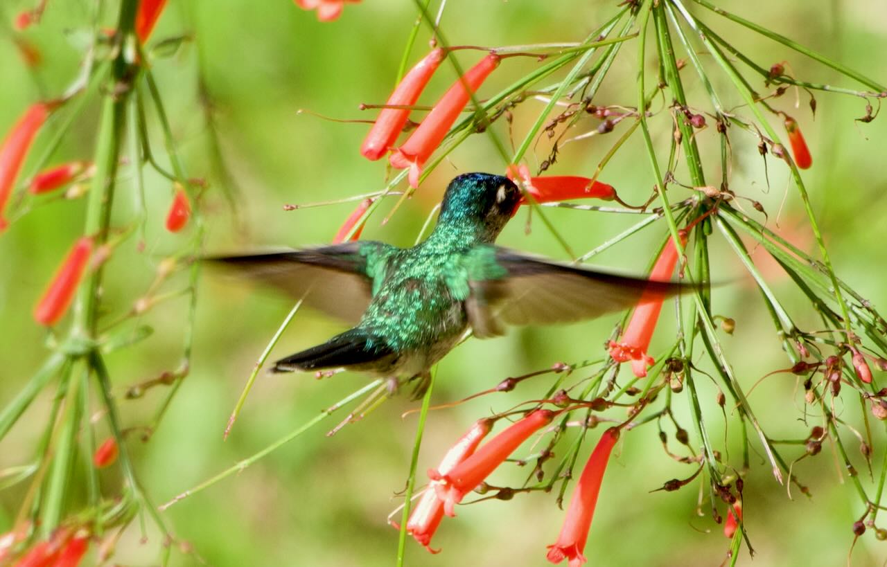 Once we were dried off a bit we went over to the hummingbird gardens in hopes of seeing something special. A few weeks back a Black-crested Coquette had been frequenting the flowers but in those weeks many of the flowers were spent and so there were fewer birds coming to them. We did see a new one though, a Purple-crowned Fairy.