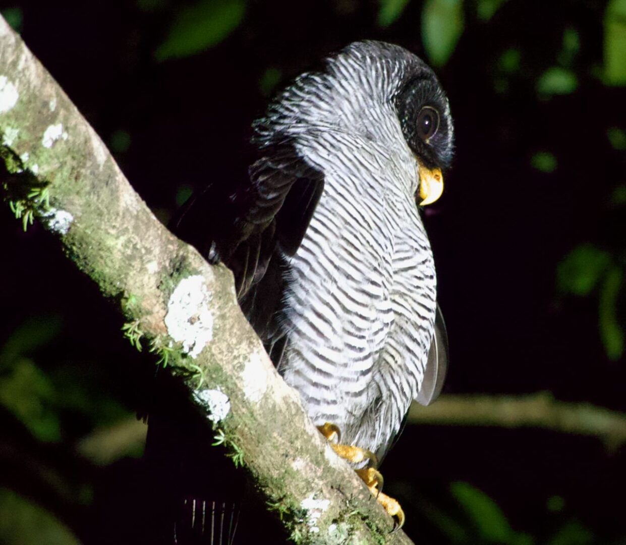 After dinner we headed back out to see about finding the Black-and-White Owl. We had heard from a birder during the day that it stays around the parking lot so instead of moving to the other side of the lodge as we did the night before, we stayed in the parking area. I went out with my pyjamas on figuring it was dark and not many people would be walking around. They have loons on them so I think it was appropriate birding clothing LOL. We only walked a short way down the parking lot and suddenly heard the owl quite close. We looked carefully and could see it in the trees and then it flew back behind buildings. We followed and got some views of it high in trees there. Then it flew again back near the restaurant and a better lit area. By this time people had come out of the restaurant wanting to see it and one of those people shines a light up towards the owl. We would not do that ourselves but we took a few pictures and then headed back to our rooms.