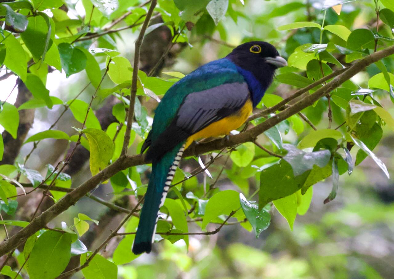 The restaurant overlooks the gardens and the feeding areas with sliding windows that you can move right out of the way. We chose a table beside the best window for viewing, the perk for so many non-birders choosing to be near the food instead. A very good thing as a couple of Gartered Violaceous Trogons were sitting in nearby trees. Jerry took some pictures and then went out to get even closer ones.