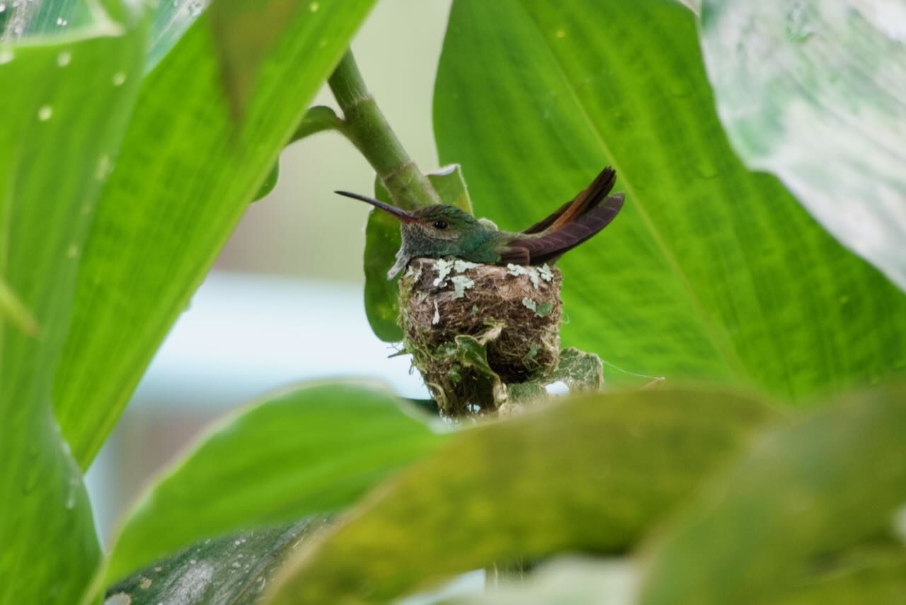 On the way back to our room we saw a couple taking pictures by a telephone pole and stopped to see what they were looking at – Black and Yellow Tanager! We had already seen these at Rancho but did not have great looks or pictures. A nice bonus and then a staff member showed us a Rufus-tailed Hummingbird nest near our room.