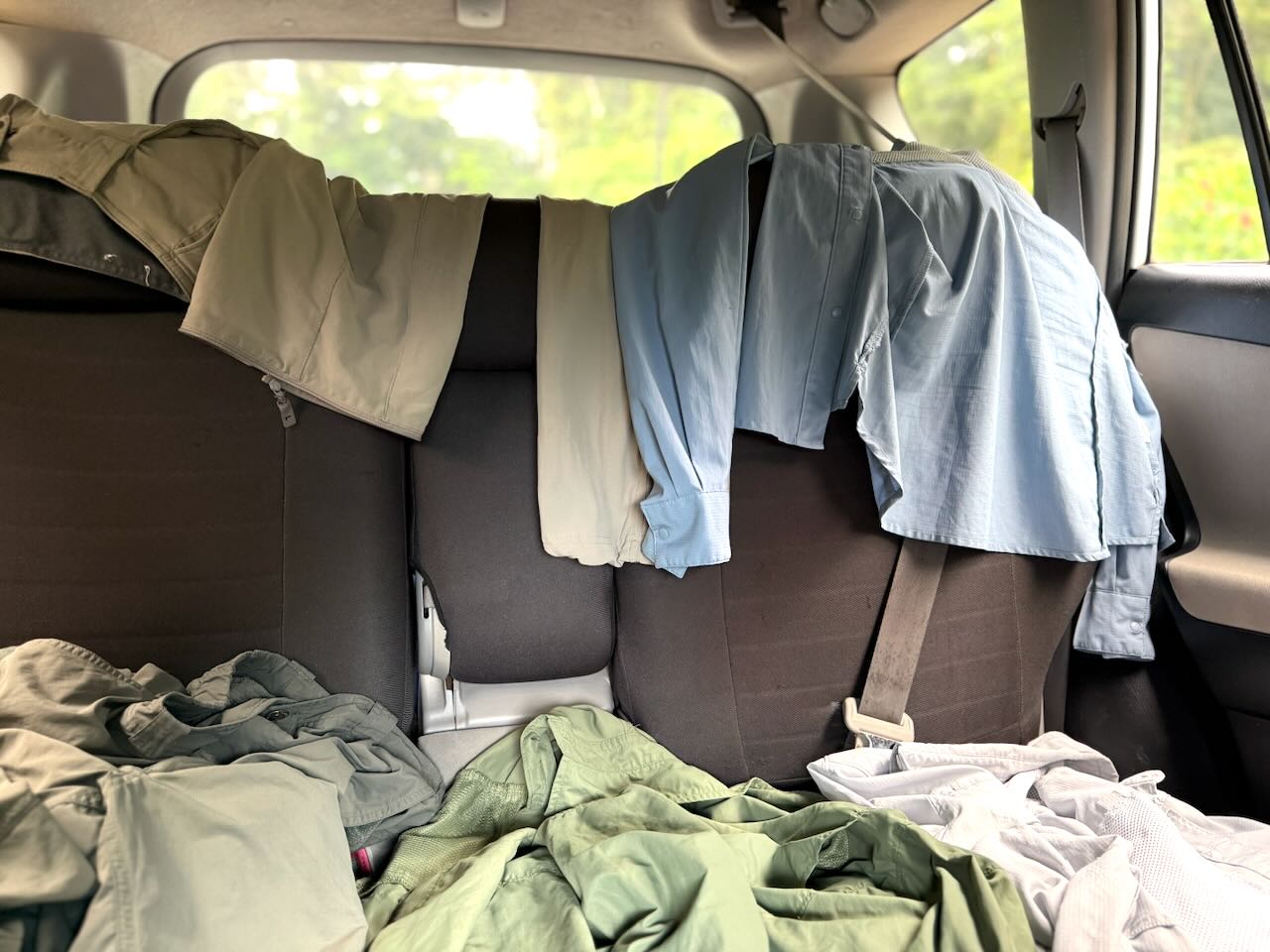 On the last morning at Arenal we had a leisurely breakfast and then drove down to La Fortuna for a date with a sloth I hoped. We had some laundry done for us at Rancho and needed to rinse a few things after the last very sweaty days but things do not dry well in this humidity so our car has become our dryer. Undies and bras hang in the trunk section. The heat in the car during the day is perfect for drying everything.