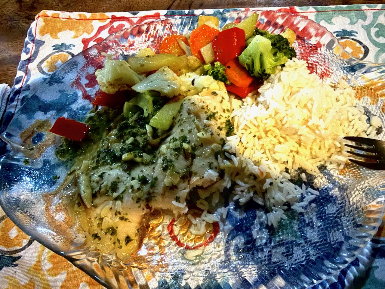 We had a yummy dinner prepared by his wife. Tilapia in white-wine sauce for me and Jerry had a Seafood with FRESH made Pasta! Served with fresh baked bread. To be in the middle of nowhere and get that kind of food is really wonderful.