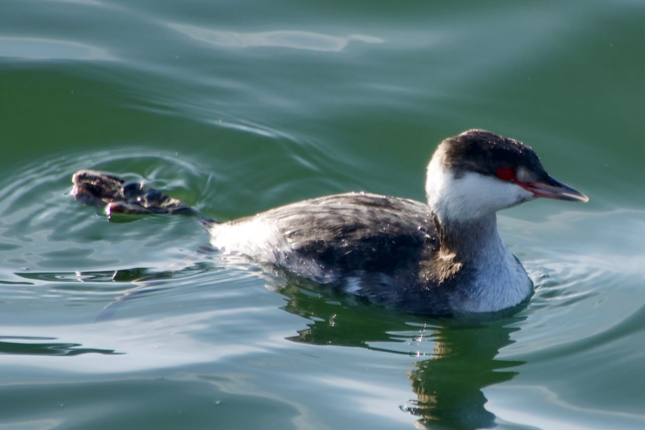 Check out that huge Grebe foot! Their feet are at the very back of their bodies making it impossible to walk on land. You can tell a Tundra Swan by the bit of yellow beside its eye. They are also noticeably smaller beside Trumpeter Swans. Below is a video of the bonding ritual head bobbing of the many Trumpeter Swan pairs that spend the winter at LaSalle in Burlington.