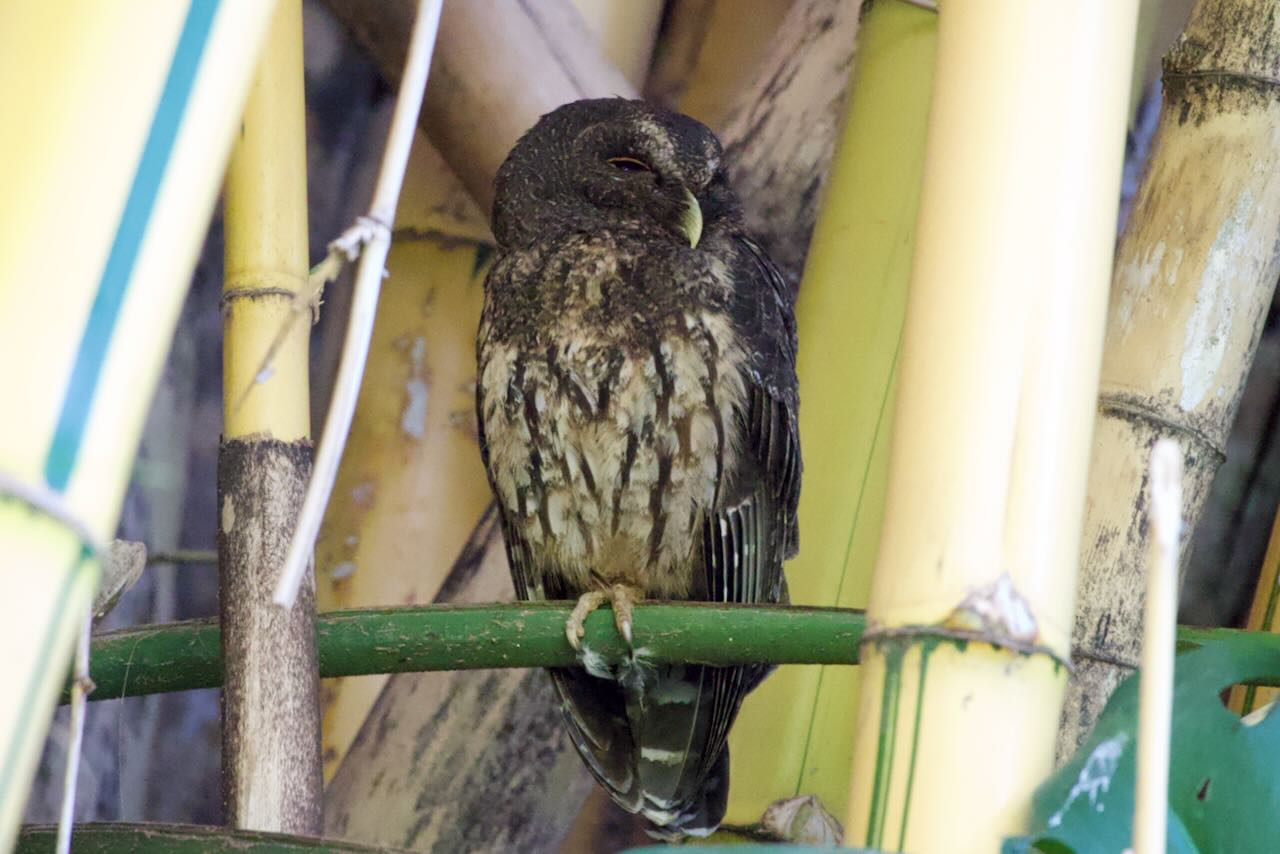 We were up again just after 4am not being able to sleep more and caught up with more pics and the blog notes before heading downstairs for 5:30. The Mottled Owl we missed yesterday was the bird I most wanted. We headed for the bamboo stand right away and the maintenance staff came out to help us look and quickly found the owl right by the path and in clear view. It was still quite dark but Jerry managed to lighten things on his camera and my phone camera did a decent job considering the low light.