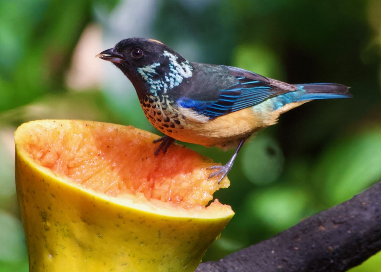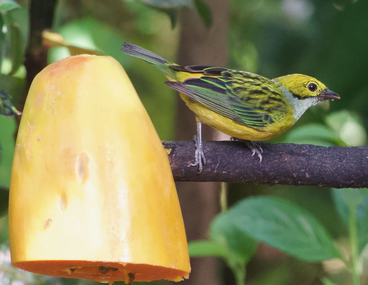 Within minutes of our arrival they restocked the feeders and the Tanagers arrived. Spangled-cheek, Silver-throat, and Flame-coloured Tanagers entertained us as they came in and out to feast on the fruit. It was lovely to get great views of these birds with them being so close.