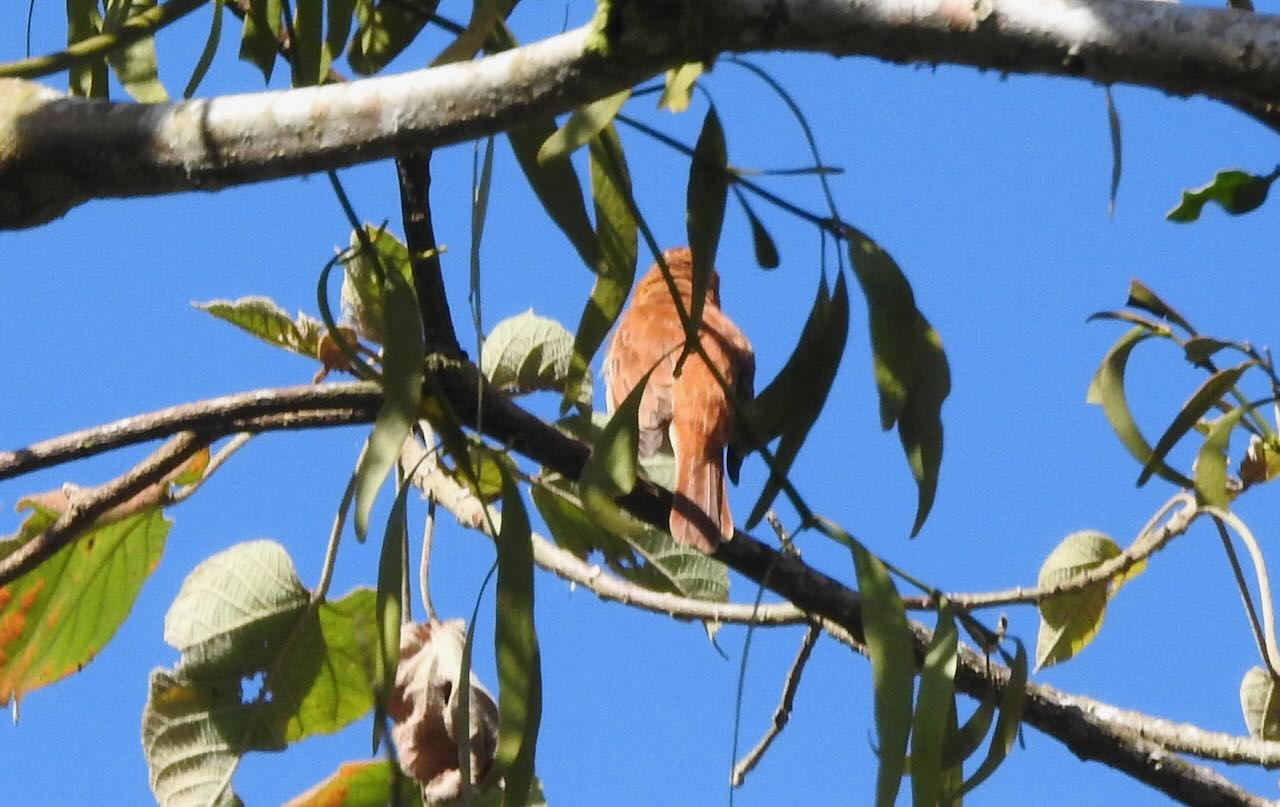 We headed into breakfast and then while Jerry went to check out I finished putting things in the car and then heard a different song, I pulled Merlin out and it reported Cinnamon Becard. A lifer – I quickly scanned the trees around the car and saw a cinnamon coloured bird with its back to me. I grabbed my camera knowing that Jerry would want me to get a pic. My camera is set on automatic so focusing is a problem when trying to get a bird in a tree of moving leaves but I snapped away and also took a video just in case. Woohoo! Somehow I managed to get a picture of it! We left the hotel with plans to make stops at the Dam and the Park for the Falcon and Owl we missed on the way in.