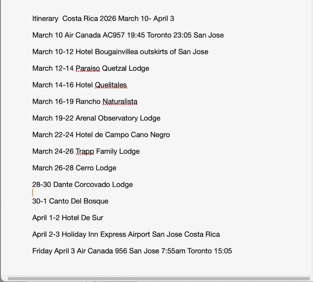 Once things were all booked we focused on familiarizing ourselves with as many of the birds as we could. We spent many evenings going through the illustrated checklist for Costa Rica on ebird and looking at photos, listening to calls and then trying to remember names the next day. Slowly, we became a bit more familiar with a number of the birds we hoped to see.