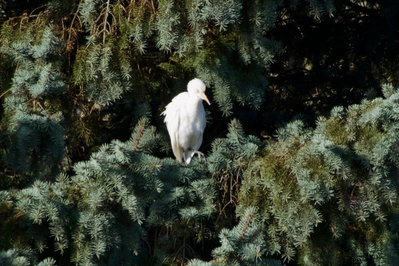 We then had to head in to care give but stopped for a quick hour hike at Dundas Conservation Area. It has become a favourite place of ours and we will be renewing our Hamilton Conservation membership so we have access to these beautiful trails next year. Late on Thursday a report came in of a Cattle Egret in the Hamilton Study Area. We listed this species back in May at Pelee but our picture is a white smudge in a field so we have been waiting for one to show up close to us to try for a better picture. We were planning on a day along the Niagara River to once again try for Kittiwake and the Egret was on the way so we did a quick stop first thing in the morning. A few birders had already seen it but when we arrived it was huddled deep in the conifer tree trying to keep warm. We waited for 20 minutes or so and it finally popped up and started preening allowing Jerry to snap a few pictures that are much better than our original back in May. It is late in the year for this bird but it had apparently been around for a few weeks feasting on worms and bugs in the nearby fields. The next day it was not re-found so hopefully it is already in a warmer southern place.