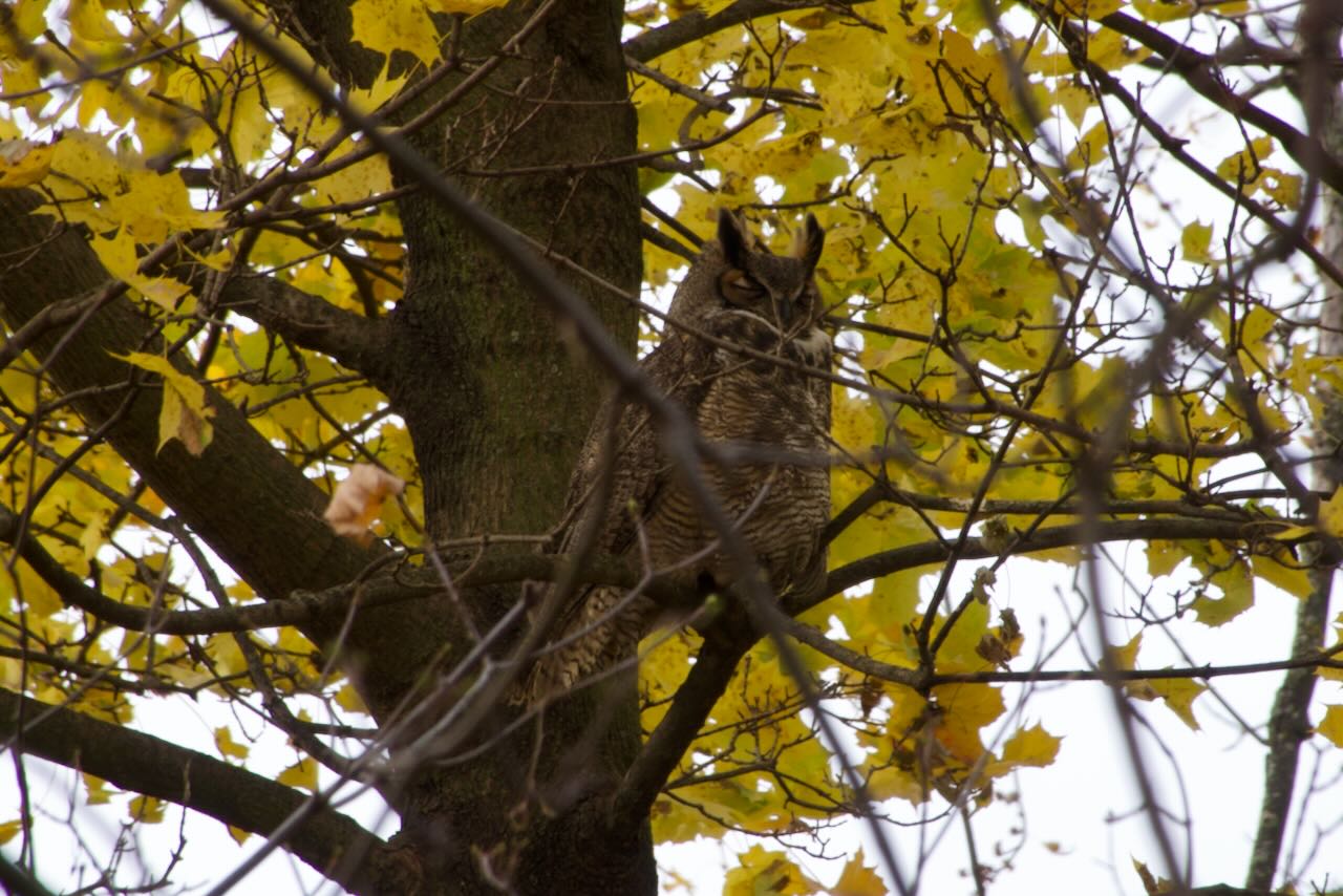 A Kittiwake was seen on Lake Huron late in the day of course! The discussion on the way home was should we head to Lake Huron and hope the Kittiwake remains? I was a bit hesitant with all the weather reports about snow squalls and horrible conditions further north. So I opted not to go first thing and Saturday morning at 8:15 a report came in of a Black-throated Gray Warbler in St. Catherines! We were out the door and arrived at Port Weller just before 10 but the warbler had not been seen since the initial sighting around 8. There were quite a few birders looking and we all spread out to wander the area where it had been seen. This is a western species that we see out in British Columbia so it definitely took a wrong turn. The area has sewage lagoons and scrubby forest with lots of potential for bugs even as the weather gets cold. We all searched, and searched but the bird was not found again although I am sure it is still there, it is a bit like looking for a needle in a haystack. We do not miss too many of the birds we chase so I guess we were due for one. A nice consolation was seeing two Great Horned Owls in the woods.