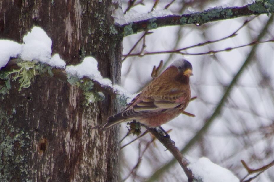 We left at our usual 4am with rain and strong winds for most of the 7 hour drive until the last 40 kms when it switched to light, wet snow making the driving a bit slippery. We arrived at the house at 11 and there were Evening Grosbeaks and a couple of Pine Grosbeaks feeding but a quick look confirmed that the Rosy Finch was not present. We anxiously panned the area over the next few minutes and then all the birds took flight and left. We kept scanning with our bins checking every movement but no Finch. We waited and I said, “I think we might have an hour or so wait until the next feeding” and 30 seconds later a bird flew into the tree by itself and IT WAS THE GRAY-CROWNED ROSY-FINCH!!!!. BIRD #335!! We were very excited but had to be quiet so we didn’t spook the bird and Jerry had to try and get pictures. It stayed around for only 5-10 minutes and moved to a few spots where Jerry got better pics and then it flew away without feeding. We left some black-oil sunflower seeds and a thank you note for the home owners and went on our way.