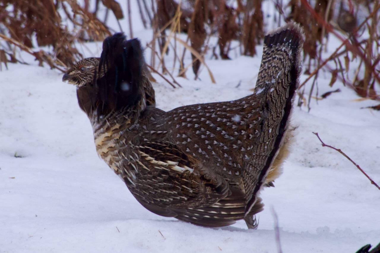At 10:15 the familiar ping from Discord interrupted that lovely walk on that northern road announcing that a Eurasian Tree Sparrow was coming to a feeder on Wolfe island near Kingston. Crap!, my nemesis bird was giving me one last opportunity but not quite chaseable when I was 8 hrs and 22 minutes away. We had discussed leaving to head home an hour earlier when we saw snow in the forecast for tomorrow but even if we had the timing would just not work out. The sparrow was one bird I was not going to get this year but perhaps it would stick around and I could get it for 2025? At the end of the day we found four more Ruffed Grouse on the side of the road and one male was showing his namesake, lovely black ruff. We could not resist more pictures and video.