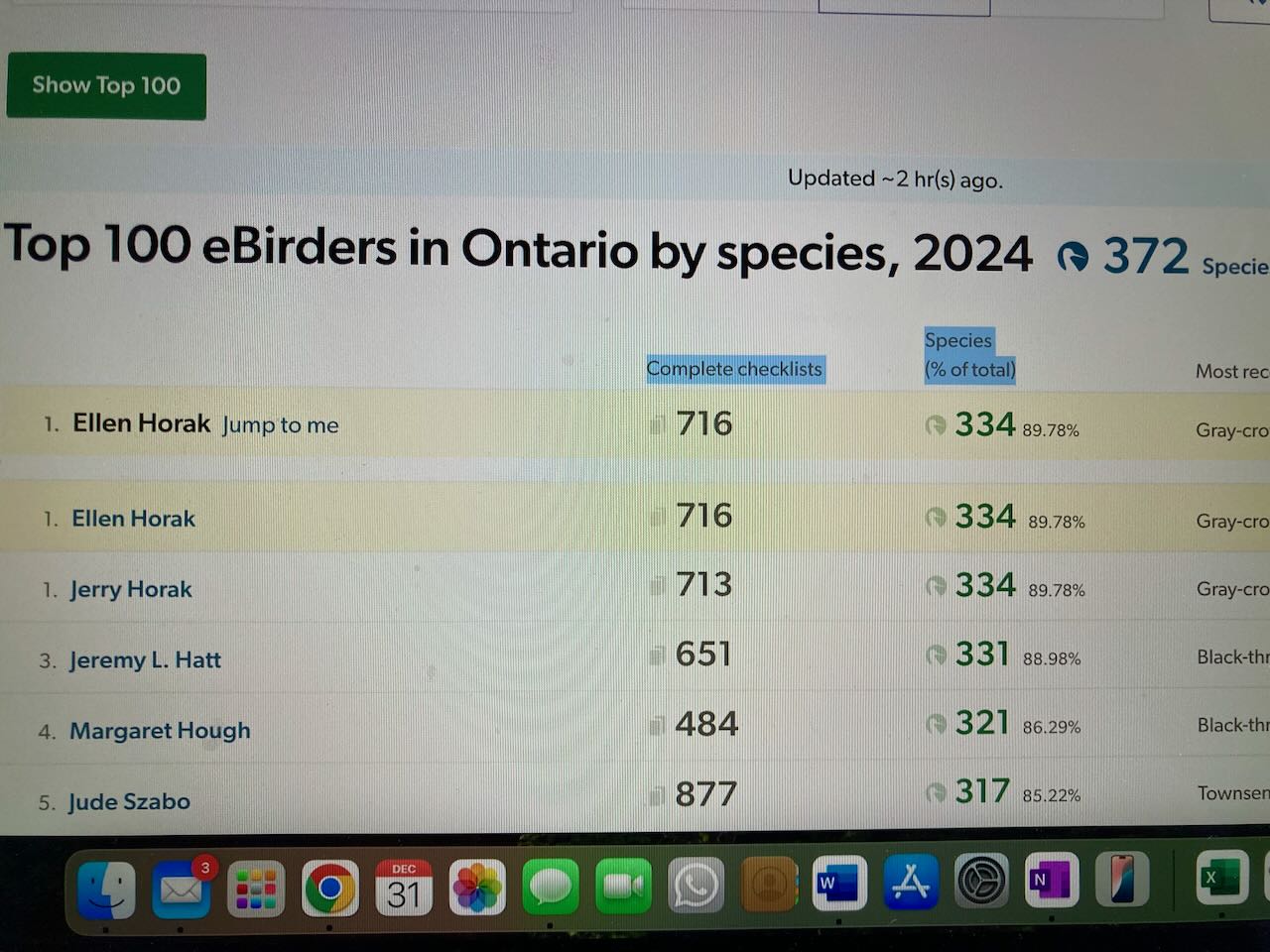 When we first announced our Big Year one of the first questions we got asked from non-birders, friends and family was “what will you get when you “win”?” They thought there was money, or a trophy, a prize of some sort, that surely no one would take on this task without some reward. But the reality is birders do Big Years simply to set a goal and achieve that goal, for themselves. At least that is why I did it. Well, I guess some people do it for the recognition from the birding community but I think the personal goal is the usual reason because I suspect that the vast majority of birders in Ontario don’t really pay any attention to the “Top 100 e-birders” list and have no idea who is doing what. I know I did not pay any attention to it until I considered doing a Big Year and I think only the people trying to get over 300 or doing a year are watching the numbers. There are many years where multiple people are doing Big Years and so only one will also be first in Ontario. I had not expected to be in the number one spot too.