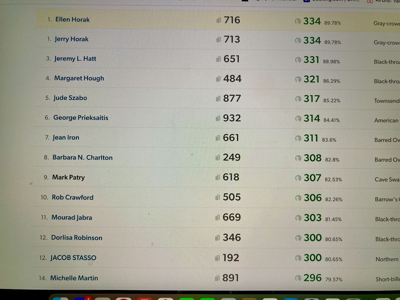 Historically, Big Years have been a young man’s game and certainly the record holders generally show that. But I wanted to show that you can be older, have other responsibilities and not necessarily be that knowledgable and still post great numbers. Technology has enabled that with up to the minute posting of rarities, ebird allows you to search where any species can be found at any given time, and apps can help you identify birds you see by song or pictures. If anyone is thinking it might be fun to try one I urge you to give it a go and take a chance. There were other birders who had committed to doing their own versions of Big Years and/or trying to get over the 300 number and I like to think maybe we inspired them to keep at it just as they inspired us to keep going. It was often the same group of us chasing rarities and that made it much more fun when we could celebrate others with their own numbers and lifers.