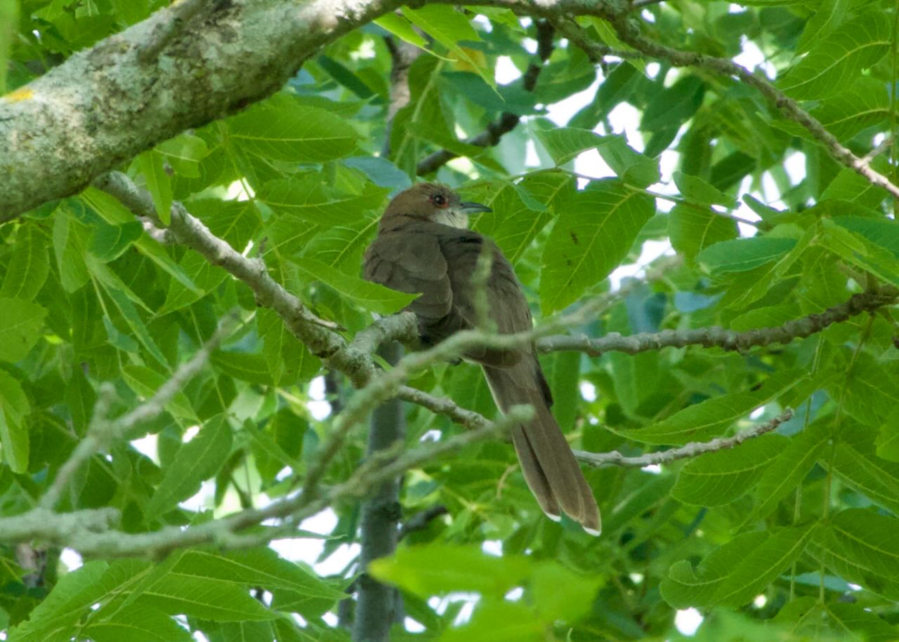 On Monday we birded locally checking some of the storm ponds. Shorebirds are the first migrants to start back and a few are starting to be reported. While we were at the Paris Stormwater Pond Jerry saw a Cuckoo flying from the field to the trees along the road. We have only heard a Black-billed Cuckoo so we hoped this bird was it. We headed out to the road and paced back and forth keeping our eyes on the trees and then heard that distinctive song of cu-cu-cu-cu-cu meaning it was a Black-billed! We waited, we watched, we looked and at long last I saw it hop onto a branch. Jerry ran over and it flew a few trees away, he managed a picture and then it flew to another tree and then flew out towards the field. We scrambled through the scrub and trees and got back out into the field and waited again. In a few minutes I saw it fly between trees and we finally had a clear look at it and Jerry was able to get some good pictures showing its black bill. Another “Heard Only”bird changed to “seen and photos taken bird.”