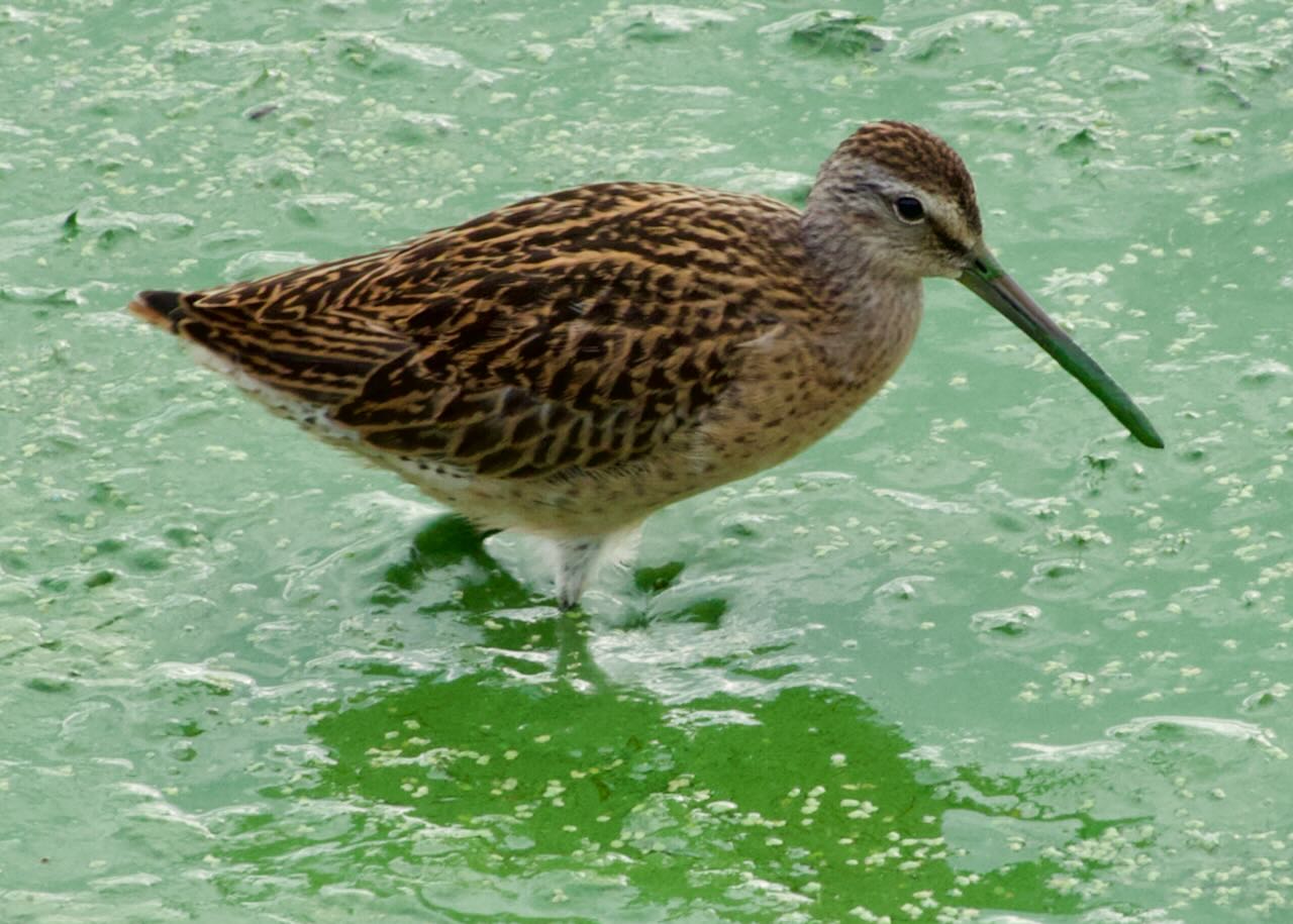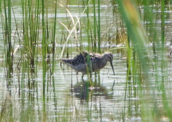 On Friday we headed to Alymer Wildlife Management Area because there had been reports of Stilt Sandpipers the last couple of days. When we arrived a birder told us that he had seen one but the lighting was horrible. The viewing is limited to permanent wooden stands and so we were facing east to see where the birds were with the sun in our eyes. In those conditions the birds are all black silhouettes but when they move you can pick up some detail. After scanning for a bit I was sure I had the Stilt – I could make out a bird with a heavy eyebrow that was dark on top and underneath. Jerry had a scope look and then tried to get pictures. We felt confident we had the bird and put in a checklist and decided to continue birding and come back in the late afternoon when the sun would be behind us. We checked out other lagoons and wetlands down near Rondeau and then headed back to Alymer in the late afternoon. I had a migraine most of the day and it was getting worse as the day got hotter so I was not as focused on birding as I usually am. We met up with another birder, Dorlisa at Alymer and searched for the Stilt to no avail. I was beginning to have second thoughts that we had seen it in the morning. We went home and looked through all the pictures and all we had were many Lesser Yellowlegs that are somewhat similar to the Stilt Sandpiper. We removed it from our list.
