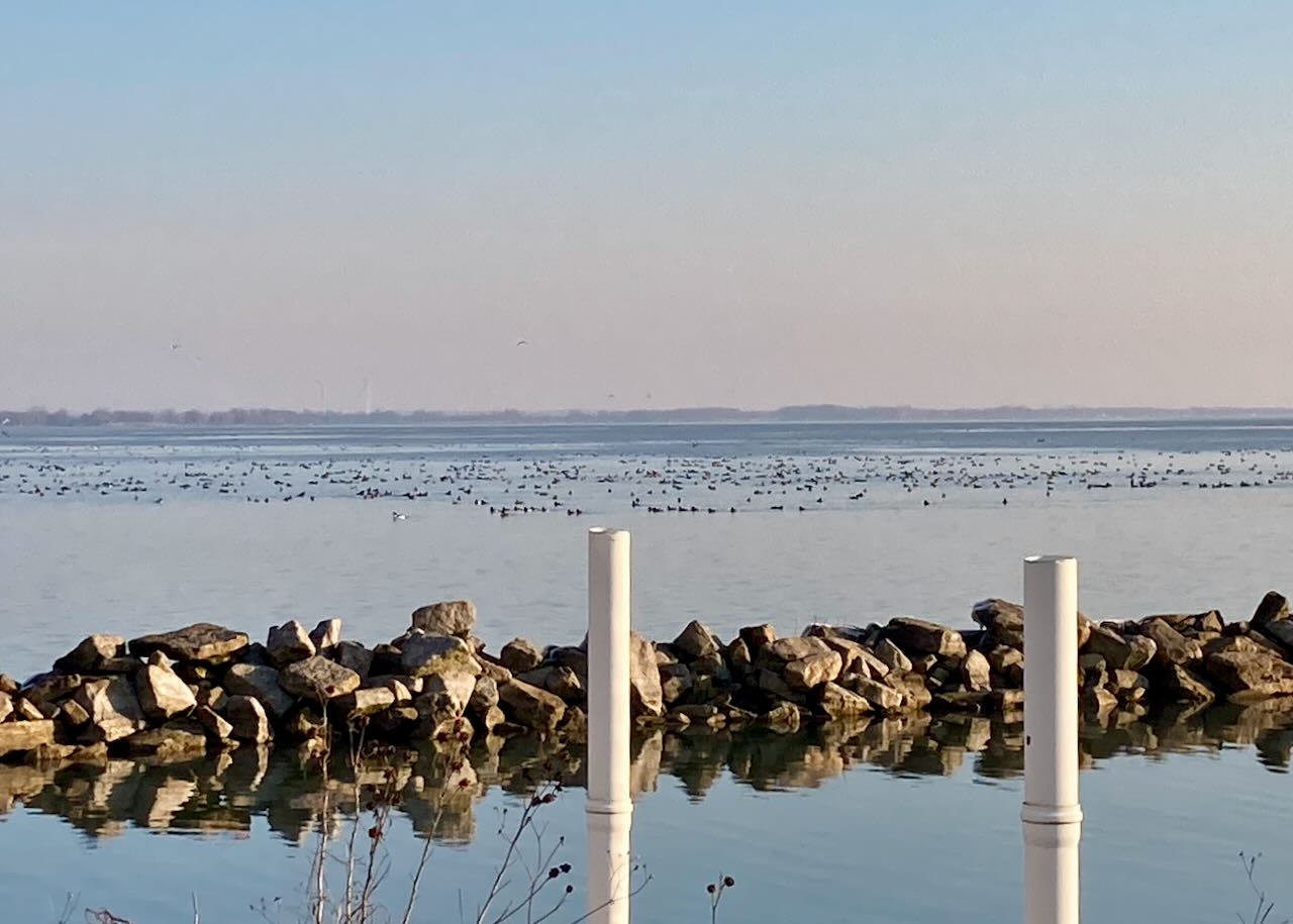 Most of the ducks were Redheads with, well red heads and the Eurasian Wigeon also has a red/rust head but with a buff/white flash on the forehead. The scope does give you good views of those black specks in the picture above but it is a challenge to move through all of those ducks looking for the one that is different from all the others. And they often have their heads in the water while they feed. We scoped for 3 hours from 7am until 10, moving down the bay, gave up and did some birding at Rondeau and then headed back in the afternoon for another 2 hours of scoping. There were other birders scoping as well so we are pretty sure we did not miss it and it is for sure still out there as birders found it again a few days later. It will probably be there till April so we will most likely try for it again unless another one is found under better viewing circumstances. I ended up with pretty achy legs and neck from all that scoping so spent some time on the yoga mat for the next few days. We took advantage of the birding slowdown to spend time with family, a rare lunch with our son and daughter, a sleepover with two of the grandkids and we care-give for Jerry’s mom 2-3 times a week in Hamilton. When we go to Hamilton we try to fit in a walk or two of birding but those did not yield anything new. Saturday I wrote the beginning of the blog resigned that this would be the first week with no birds added.