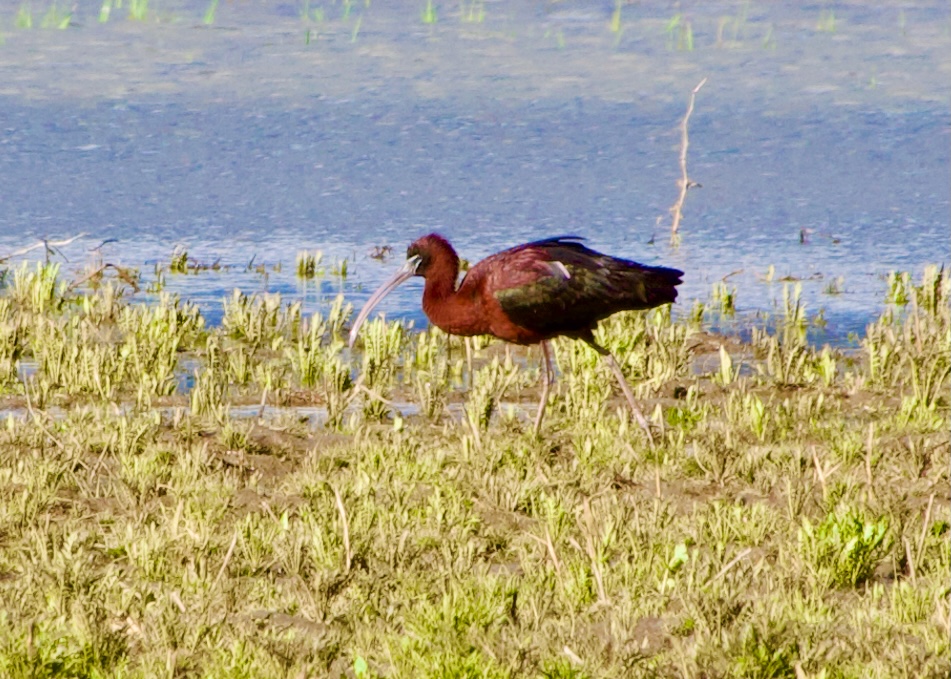 We didn’t find any Willets at any beaches or marshes so we went into the Park and enjoyed seeing small groups of migrant warblers making their way up the east side of the park. We added 2 common species and then I heard the Discord ding…Glossy Ibis, Orillia. I wanted to leave right then, Jerry wanted it confirmed. It was confirmed 40 minutes later and we were on the road from Pelee. UGH!, why had we not opted for Toronto? With still 2 hours till we arrived another DING!… it had flown. Now things got a bit heated in the car. What to do? In bumper to bumper traffic, will the bird be found or do we turn around? We were both tired and hungry and our ETA was 5:30. We opted to keep going, once you commit you have to follow it through, the bird could return, or be re-found. Ten minutes later it had been re-found! One hour to go! When we finally pulled up there was a birder, Rick, pulled over at the spot and we could easily see the bird from the road without bins (always the happiest when that happens). We spent about 30 minutes watching, taking pictures and video and just enjoying the dopamine buzz of GETTING THE BIRD!