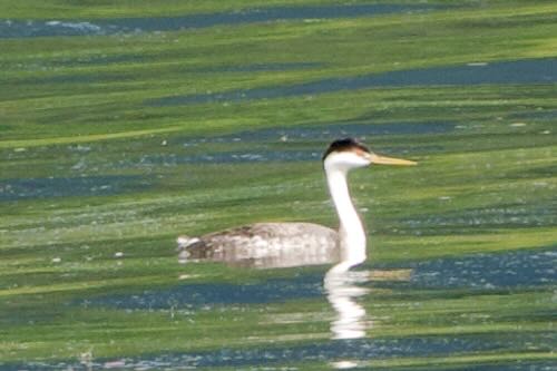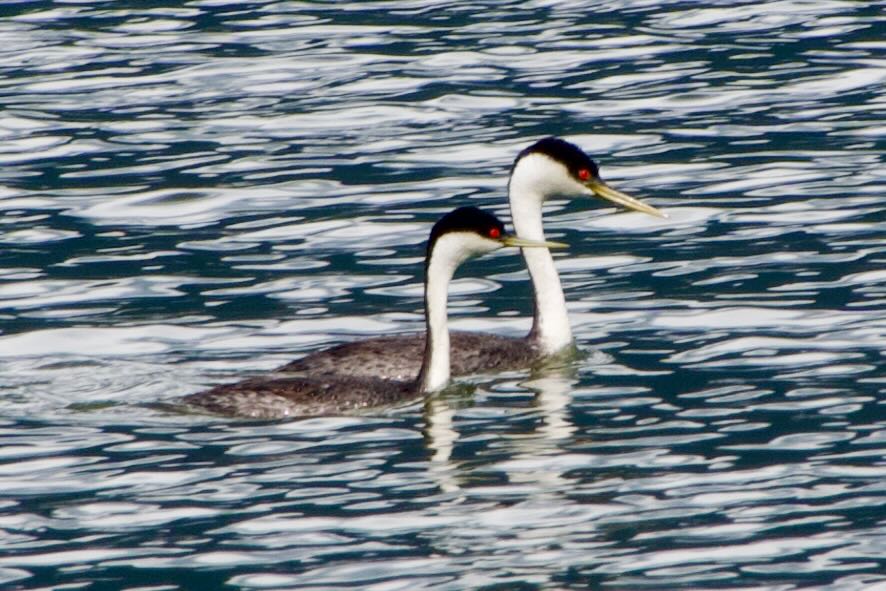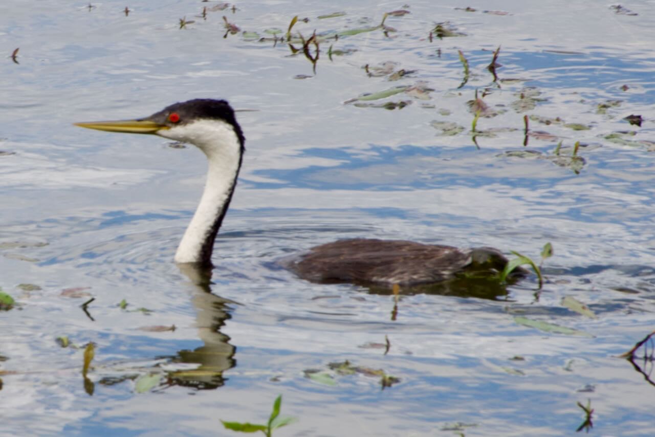 There are hundred’s of Western Grebes on the lake but only a few Clark’s Grebe and the difference between them is subtle. The black cap on the Western extends below the eye and above on the Clark’s. The Clark’s also has an oranger bill.