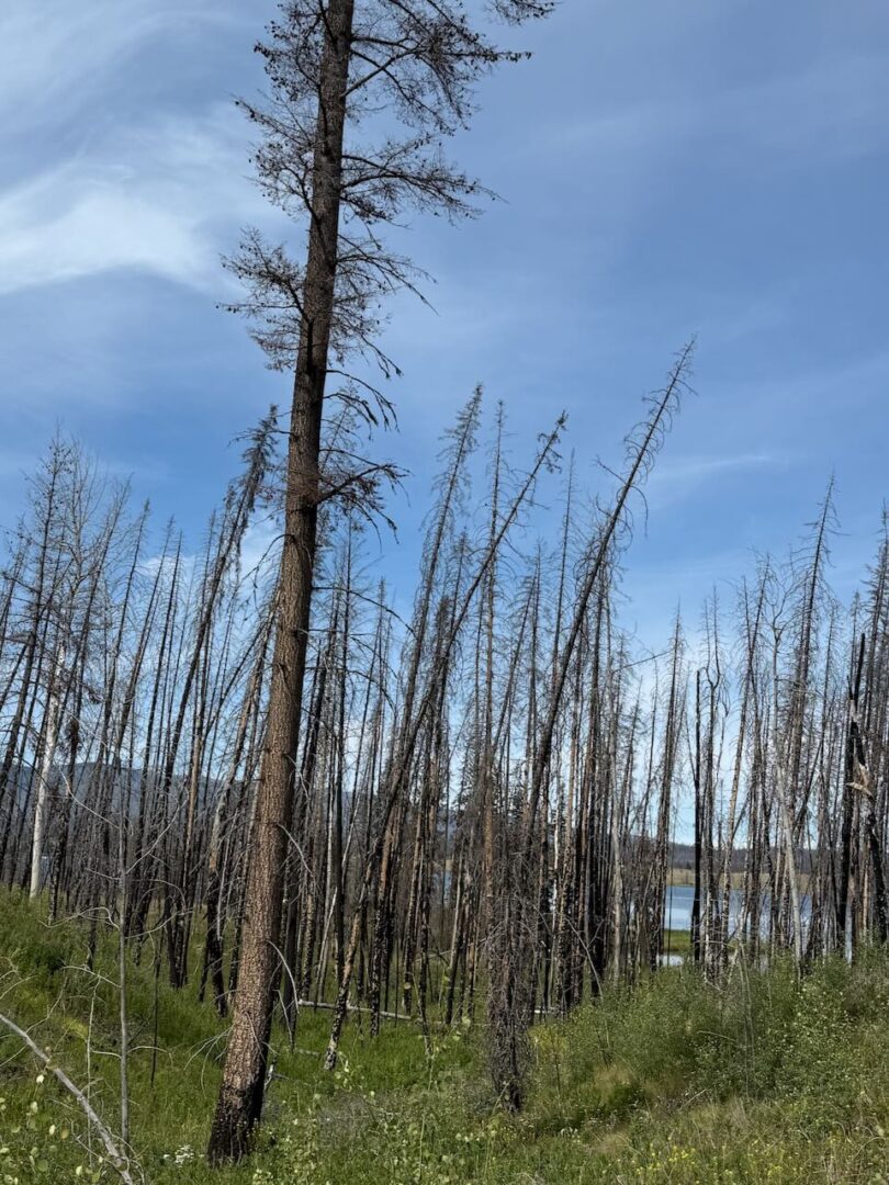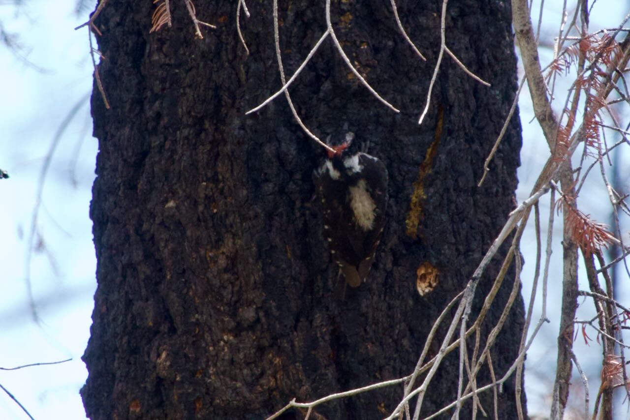 Getting the Chukar so quickly meant we had a “free day” on Friday so I researched a few places to visit and we headed to Tunkwa Provincial Park. We still have not added Black-backed Woodpeckers and American Three-toed Woodpeckers to our list but these birds can be found in most provinces so I have not made them a priority yet. They are specialists in burned areas eating larvae that is deposited in newly burned trees. Tunkwa burned in 2021 and there are still a few reports of these woodpeckers being seen so we thought we would check it out. It is not easy to look for black woodpeckers that might be on black trees as you can see from the picture below of a Hairy Woodpecker. Despite careful looking and listening we did not turn up the ones we need.