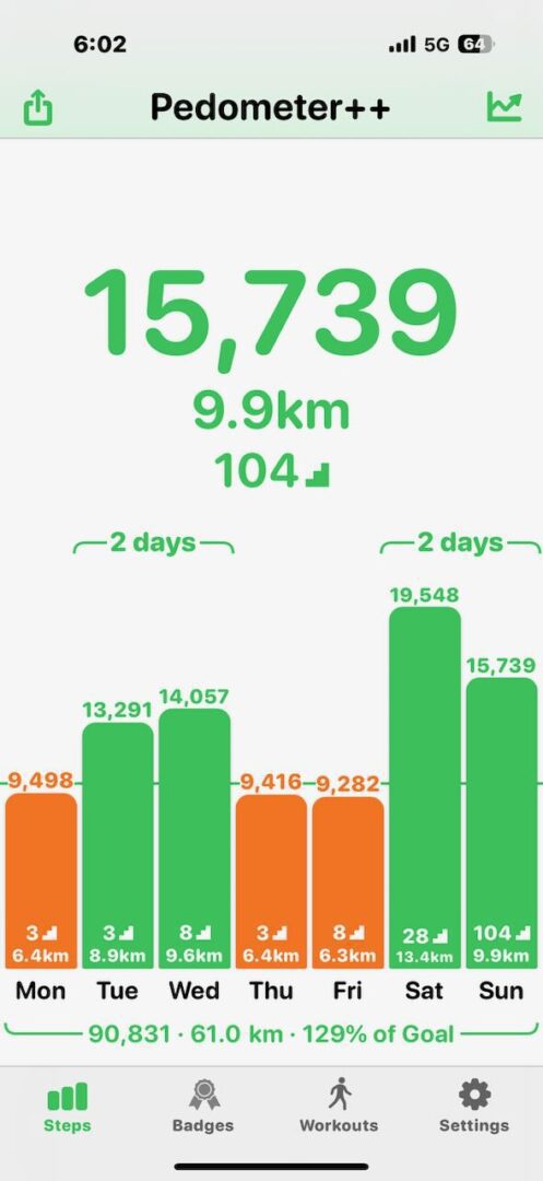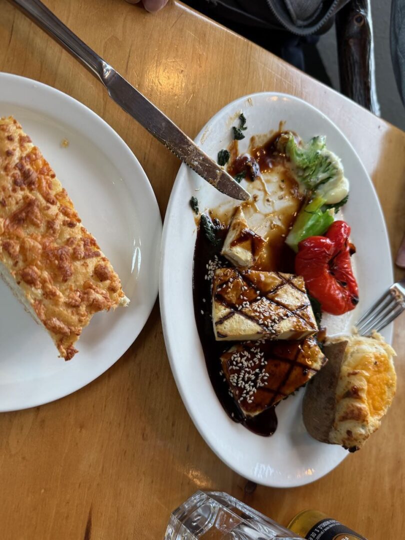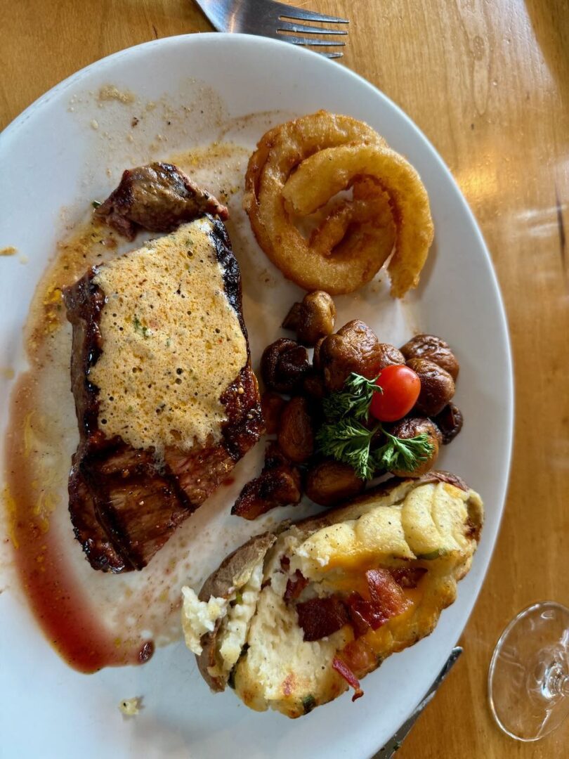 We managed to walk almost 20,000 steps, 13.4 km with 28 flights of stairs and still checked into our hotel by 4. We had a quick shower and treated ourselves to the “best” restaurant in the small community where we finished 6 weeks of road tripping with a real steak for me and a tofu steak for Jerry. While not my usual home grilled filet mignon it was still yummy and the cheese bread and seafood chowder very tasty.
